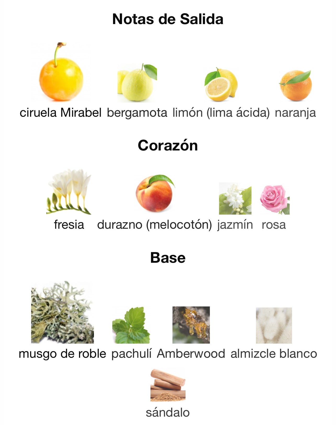 Notas de Salida son ciruela Mirabel, bergamota, limón (lima ácida) y naranja.